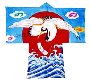 文鶴(ふみづる) (7,8) 鶴が大漁を知らせる文を届けに来るという、非常に縁起が良いとされるモチーフです。鯉金と同じく、広く取り上げられているデザインで、やはり、凧屋さんにより、背景や鶴の文のくわえ方などに違いが見えます。