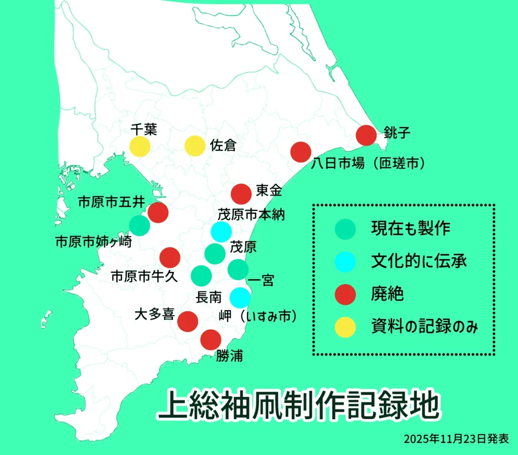上総袖凧が作られた地域は、房総半島東側、九十九里沿岸の南部の勝浦市から、中心地の茂原長生地域を経て、北は銚子市に及びます。