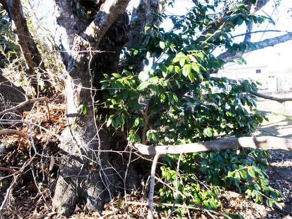 芽木の生えだしている台木の中央部から、細いササの他に、ツバキと思われる常緑樹も生えています。