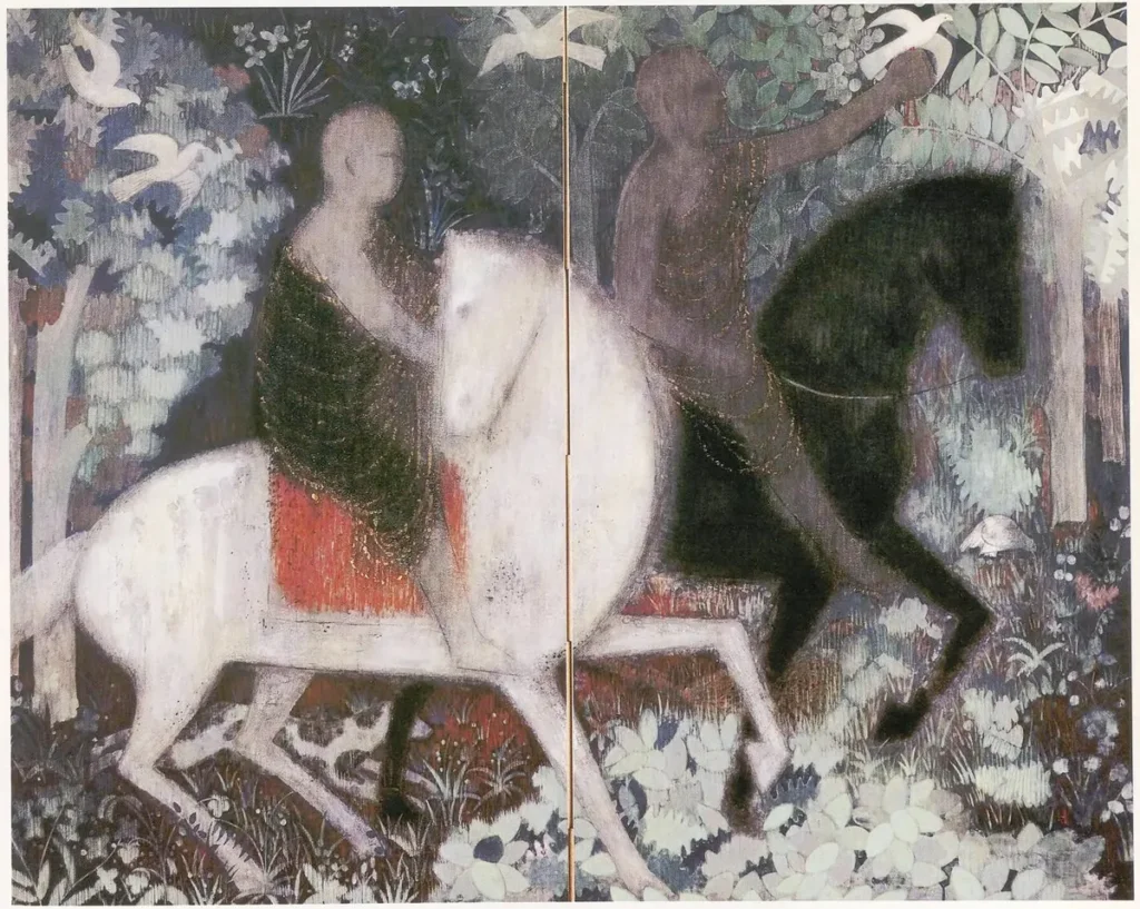 構図は唐代の高僧・玄奘三蔵(げんじょうさんぞう)がインドから仏典を持ち帰る途中のシルクロードのオアシスを通る様子を描いています。以降、仏教の日本への伝来をテーマにした作品を数多く発表されました。