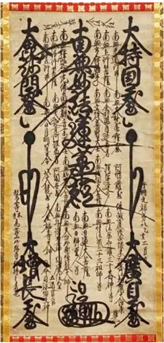 題目「南無妙法蓮華経」と書かれた周囲に漢字・梵字で記された仏・菩薩、仏弟子、天台系の学僧たち、インド・中国・日本の諸神々の名号などを配置した大型の掛け軸で、日蓮聖人が仏の悟りの世界を文字で表現したものです。