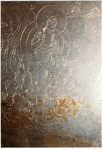 こちらは第三経塚出土の国宝「線刻阿弥陀三尊来迎鏡像」(せんこくあみださんぞんらいごうきょうぞう)の2点ある内の1点です。